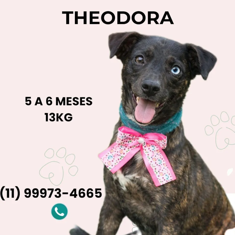 Theodora é uma filhote encantadora!Com sua pelagem tigrada e um olhinho azul hipnotizante, ela é pura doçura e personalidade.Tem cerca de 5 a 6 meses e pesará 13 kg (aproximadamente).Carinhosa, curiosa e cheia de energia — está pronta para encontrar uma família que a ame de verdade!Contatos: WhatsApp (11) 99973-4665 (somente mensagens)Mais peludinhos disponíveis para adoção em nosso Instagram @kantinhodospeludos