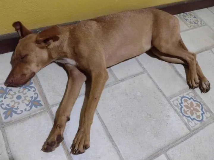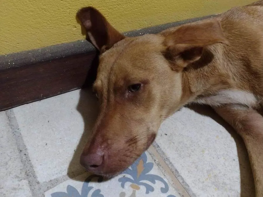 Encontramos ela em Imbassai, na Bahia. Ela tem Olhos verdes, pelo curto, tem o pelo cor de mel e no peito é cor branca. É muito boazinha, gosta de crianças, claramente está perdida ou foi abandonada...