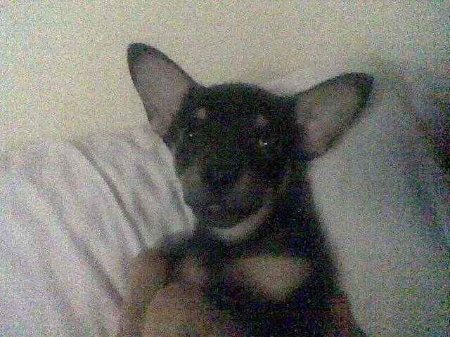 Minha Akira, uma pinscher que foi equivocadamente levada por uma Senhora que entendeu estar abandonada quando a viu presa num arbusto do jardim pela coleira e guia amarela, enquanto eu almoçava no estabelecimento "Pão com manteiga" - Av. Edgar Facó, 1750 - na terça-feira (26/03/13) por voltas das 15:30 min.