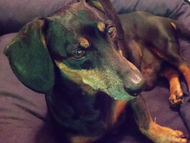 BASSET (SALSICHA) DE PELAGEM PRETA E MARROM COM MANCHA BRANCA NO PEITO.