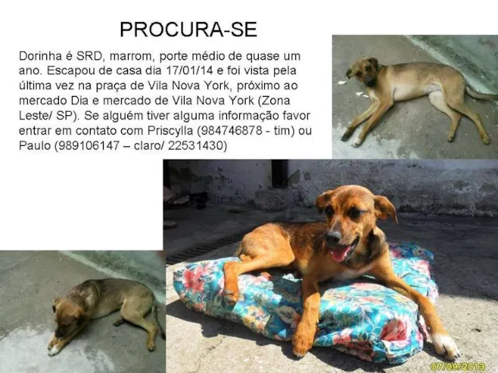 Dorinha escapou de casa dia 17/01/2014. Procuramos por 3 dias e descobrimos que ela foi atropelada em uma av. próxima (Av. Pastor Cícero Canuto de Lima, Vila Nova York, SP) por uma tucson marrom. A pessoa a socorreu, mas quem estava no local achou que ela fosse de rua, por estar sem coleira, então levou a cachorra sem deixar os dados.