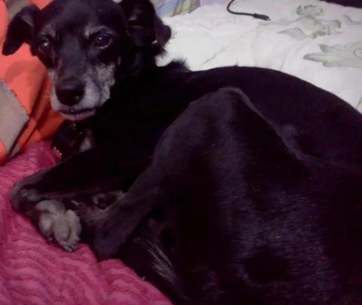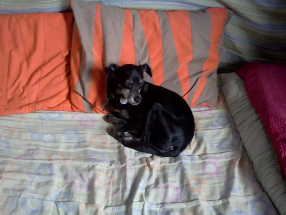 Ela é pequena (como um pinscher), preta com o peito branco, parece ter uns 8 anos, está usando uma coleirinha salmão com pingente da prefeitura.