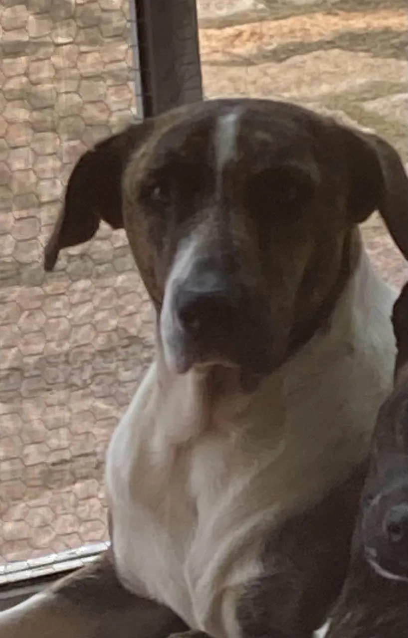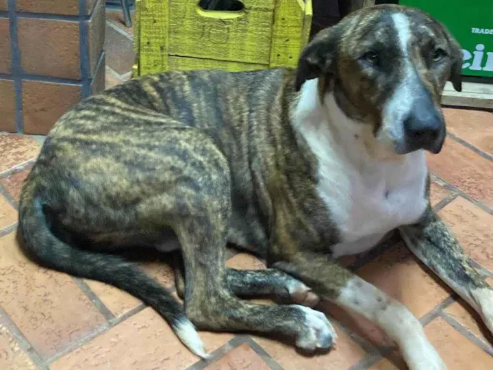 Chama Bruce, tamanho grande, malhado marrom e branco