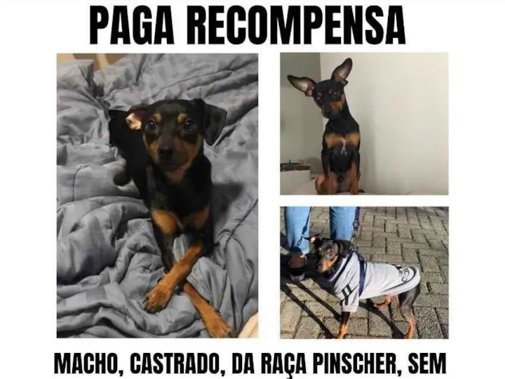 Joca é macho, castrado a pouco tempo, não tem rabinho, pêlo curto preto com marrom, mancha branca no peito, porte pequeno da raça Pinscher, ele é bastante medroso e assustado, pagamos recompensa pra quem encontrar, estamos desesperados para encontrar ele. Por favor qualquer informação entrem em contato (11) 98824-7372