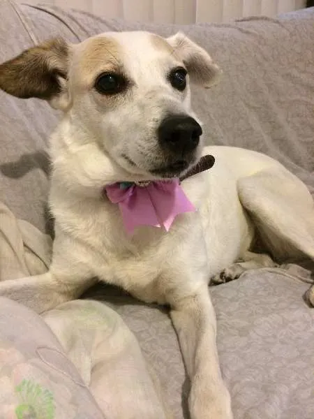 SRD, porte médio, branca com manchas beges na cara e na orelha direita, magra, pernas e rabo compridos. Foi vista na região do Parque do Nabuco, Cidade Ademar, São Paulo - Capital. Os relatos dizem que está com machucado nas costas. Está usando uma coleira vermelha bem gasta. É dócil e meio ceguinha.