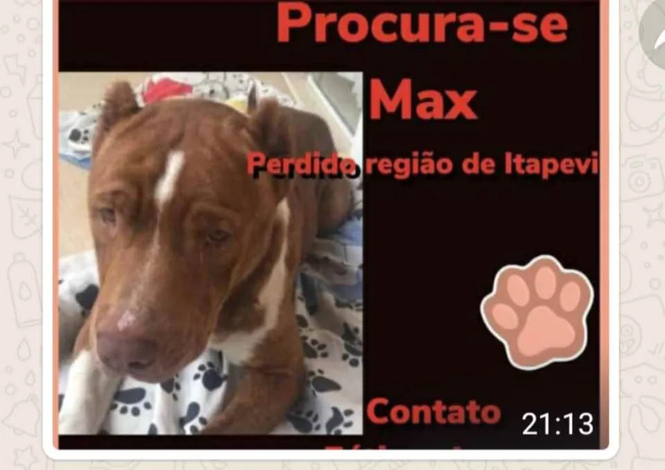 Orelhas cortadas, sem castração, uma mancha branca na testa, anêmico, desnutrido e com tratamento de antisséptico para as feridas de carrapatos, dei um dia e meio de lar solidário, a pedido da protetora Alessandra Pimenta que entregou ao irresponsável adotante Leonardo de Medeiros Furtado Jr, que quando o MAX não se adaptou a casa, ao invés de devolver aos protetores conforme compromisso assumido emprestou ao amigo dele para ser cão de guarda numa loja e alega que houve um suposto assalto a mão armada, roubo, e um hipotético vigilante rendido e amarrado e o cachorro fugiu ou foi roubado