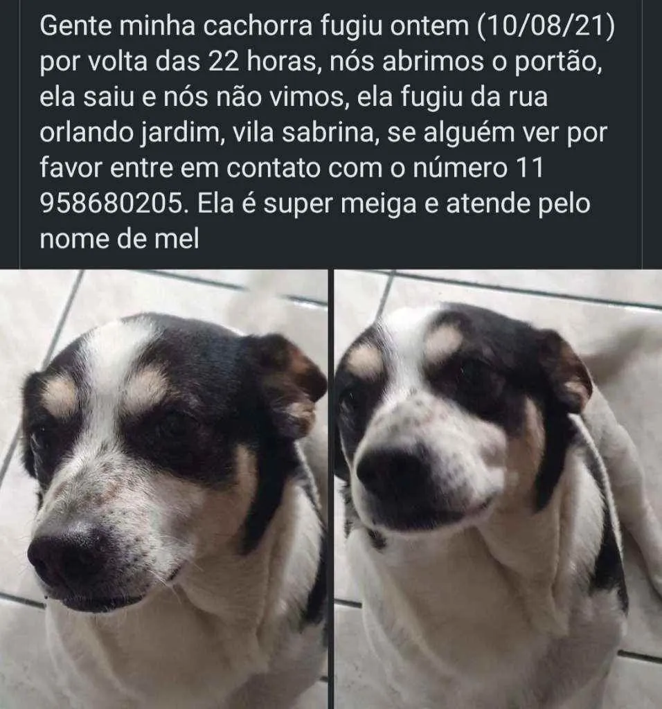 A MEL É SUPEE DÓCIL, PERDEMOS ELA ONTEM NA RUA ORLANDO JARDIM, VILA SABRINA, FOMOS GUARDAR O NOSSO CARRO NA GARAGEM E NAO PERCEBEMOS QUE ELA TINHA SAÍDO, HOJE DE MANHA EU PERCEBI E JA RODAMOS TODO NOSSO BAIRRO E OS BAIRROS MAIS PRÓXIMOS E NADA, TENHO CERTEZA QUE ALGUEM VIU ELA ASSUSTADA E A RECOLHEU PRA NAO FICAR NA RUA