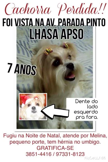 Sumiu na noite de natal por causa dos fogos. Família desesperada! Foi vista na av. Parada Pinto. Alguma informação ligue 973319123 por favor!! É uma filha pra gente e não vai se acostumar em outro ambiente! Tem hernia no umbigo!!!!!