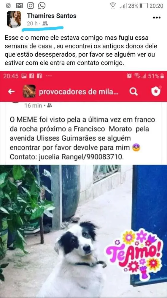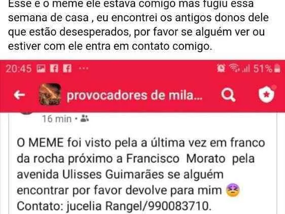 Macho / MédioO MEME foi visto pela última vez em franco da Rocha próximo a Francisco Morato pela Avenida Ulisses Guimarães se alguém encontra por favor mim devolver 990083710 a Senhorita Tamers tinha encontrado ele irá mim devolver mais antes ele escapou, está com ela em Avenida Ulisses Guimarães .