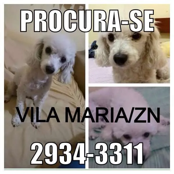 Desaparecida dia 23/04 na Zona Norte Vila Maria alta, é uma poodle de pelo branco, está tosada, é muito dócil seu porte é pequeno/médio. Gratificaremos quem encontrá-la.