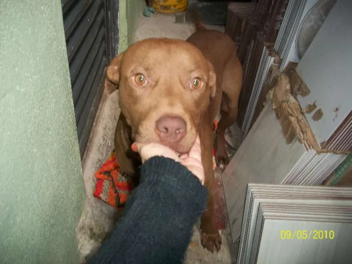 Ele tem uma coleira com uma medalhinha com meu telefone. Ele é extremamente bobão, manso, só que as pessoas tem medo de chegar perto porque ele é de porte grande e tem a cabeça de pitbull.