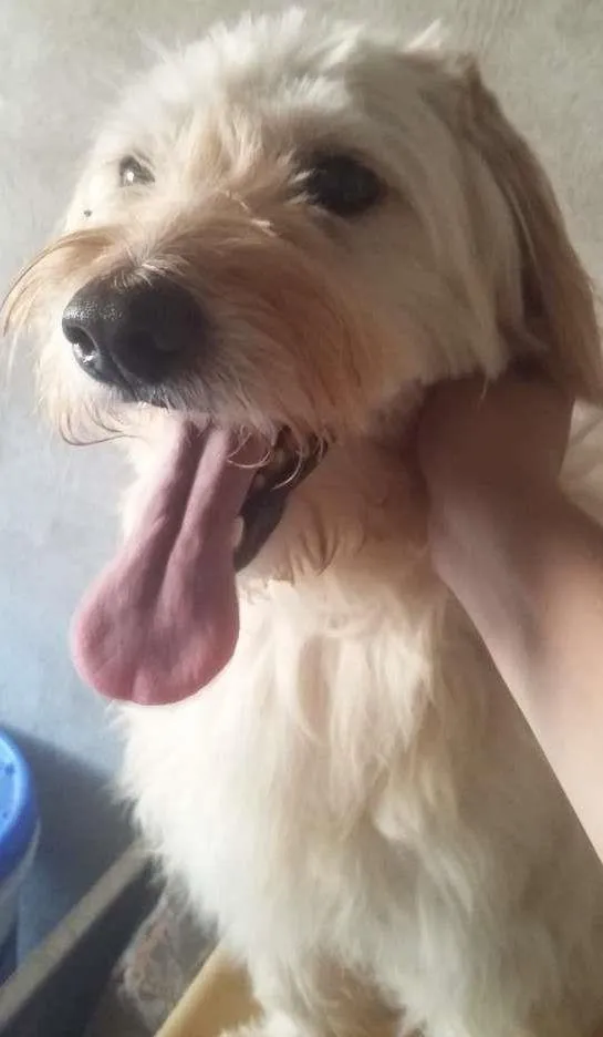 Ela é branca bem peluda deve estar suja pois cavou um buraco para fugir e tinha a orelha e rabo com os pelos um pouco mais escuro e tinha uma sicatris no nariz