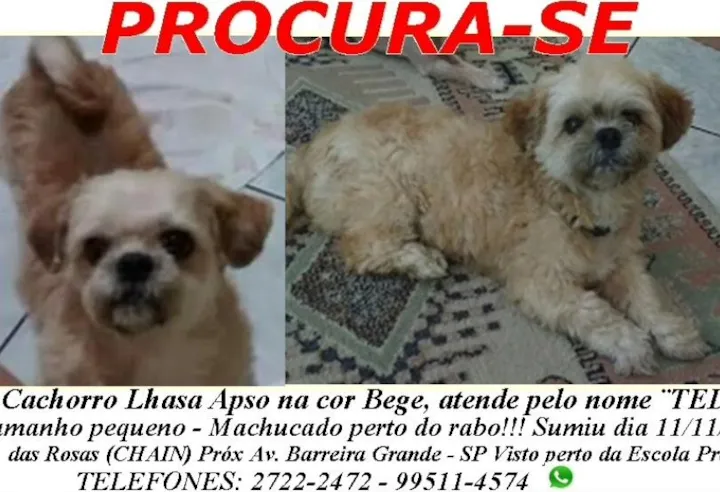 Meu cachorrinho Ted, pelagem beige e marrom claro, de 5 anos, porte pequeno, perdeu-se no dia 11/11/2016 (Sexta Feira), no bairro Jd. Das Rosas SP, e foi visto pela última vez, no dia 12/11/2016 (Sábado), na Avenida Renata Vila Formosa SP.