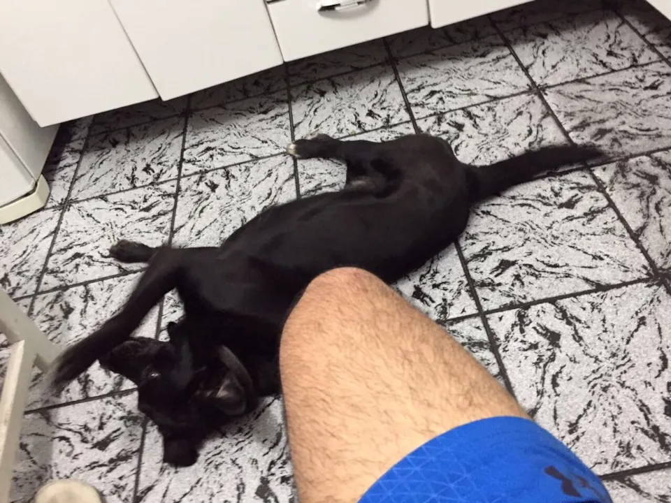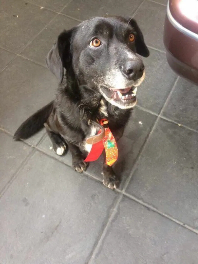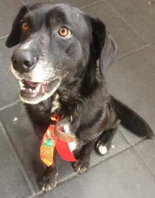 Vira-lata, lembra labrador. Muito dócil, pelagem preta, focinho ficando branco pela idade, parte do peito e pescoço brancos. Alguns dentes da frente, inferiores, caíram. Brincalhão e amoroso. Muito amigo. Sumiu em janeiro, estamos muito preocupados!