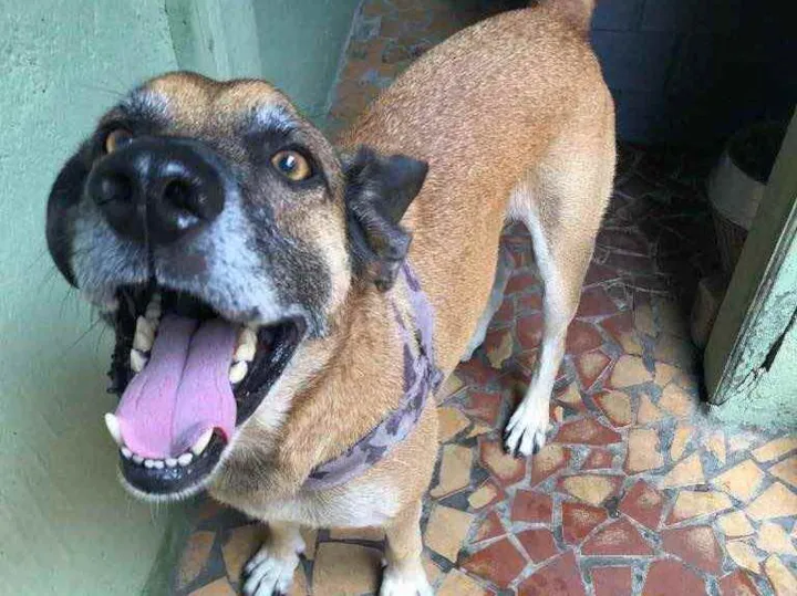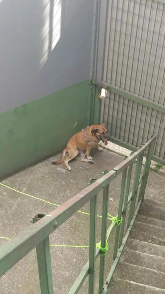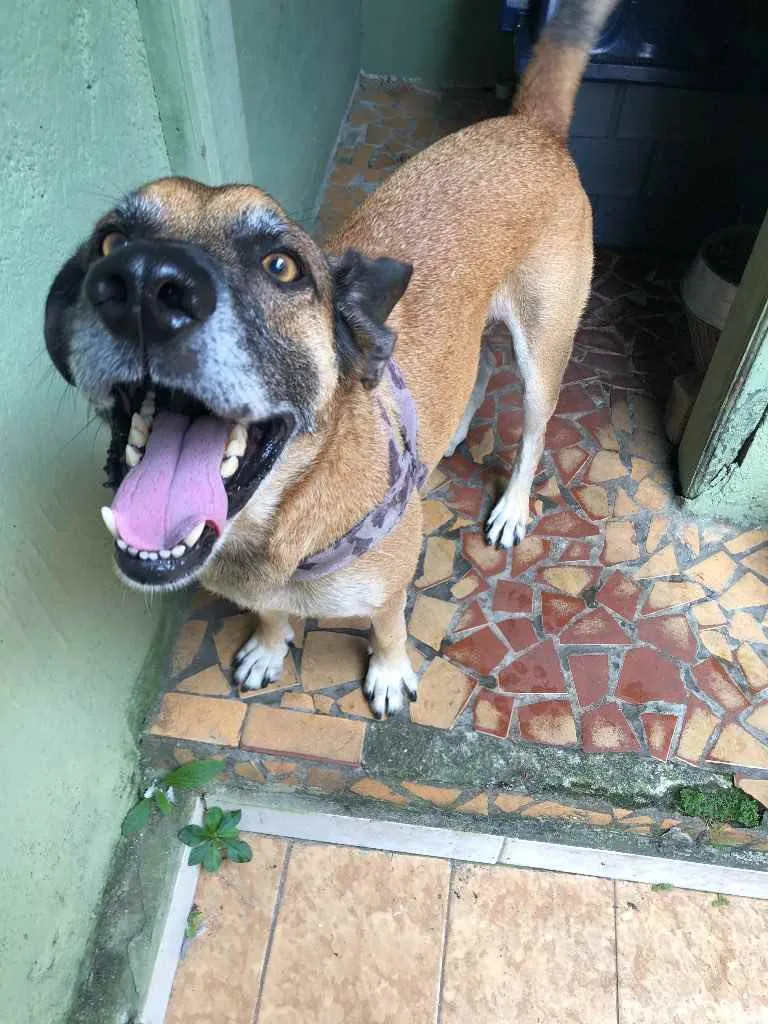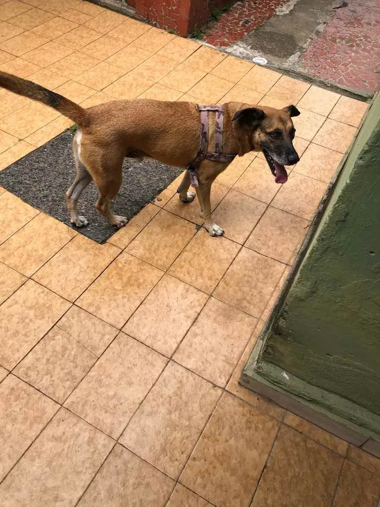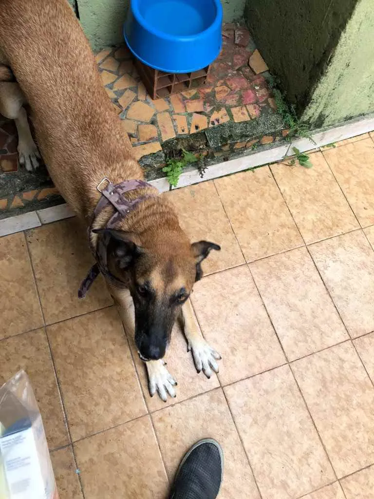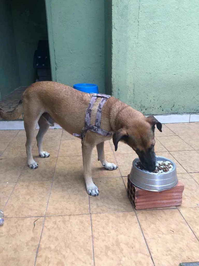 Atende por TROVÃO, está com uma coleira de peitoral e com uma identificação com nome e telefone