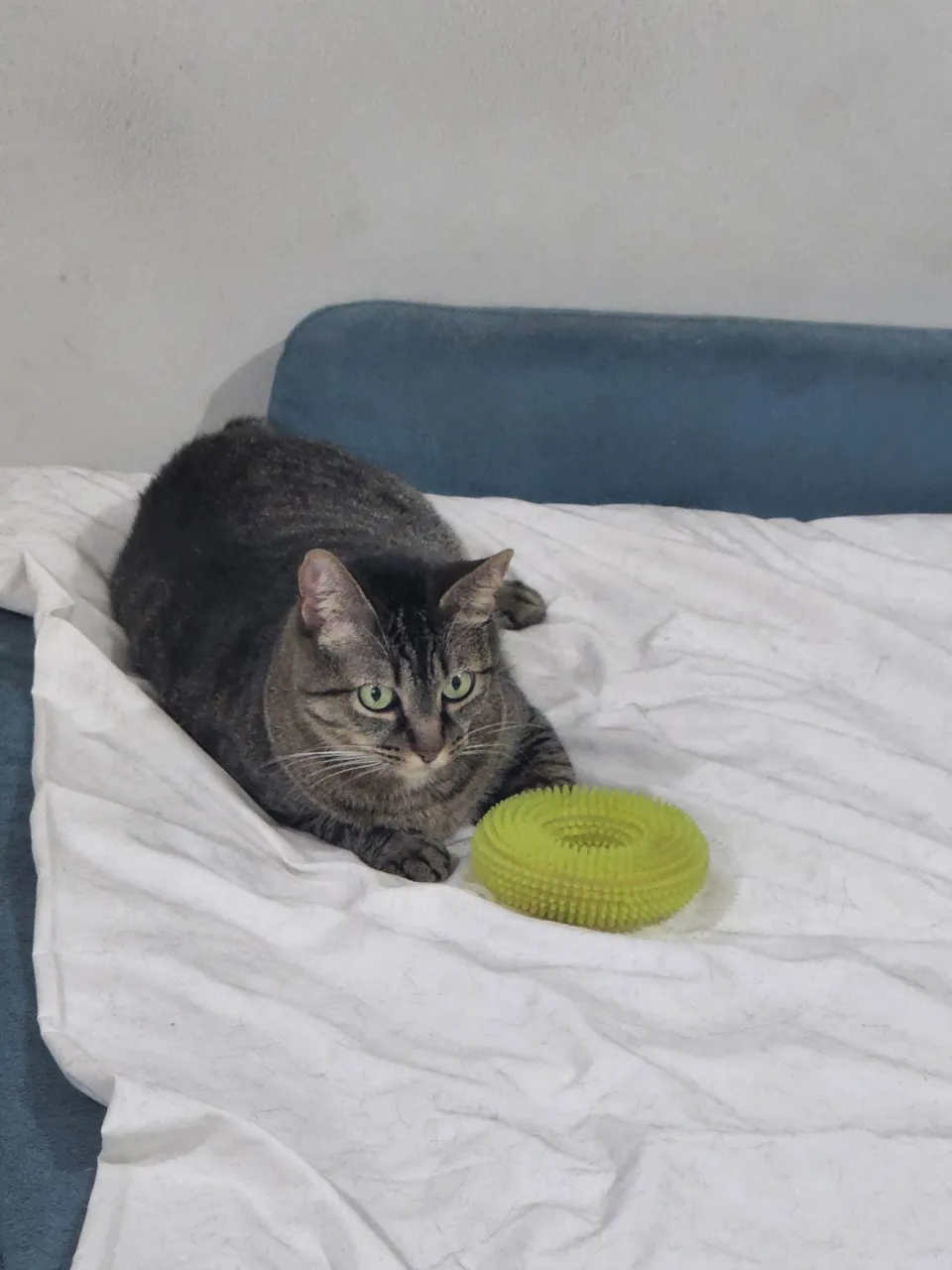 Angel, gata de 4 a 5 anos, mansa e carinhosa, está para adoção. Castrada, vacinada e microchipada. Possível adoção conjunta com Gaya. Inclui ração e areia.