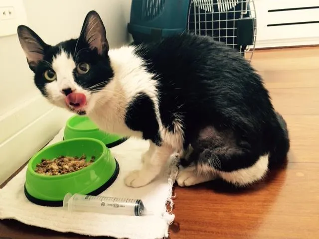 Galera esse é o Bichano, foi atropelado por uma colega nossa, foi socorrido por ela, ficou internado, machucou o maxilar e semana passada já teve alta, sua recuperação foi muito rápida e significativa. Hoje está com a moça que o atropelou, até conseguirmos juntos, um lar para esse mocinho.