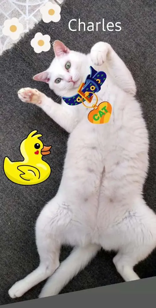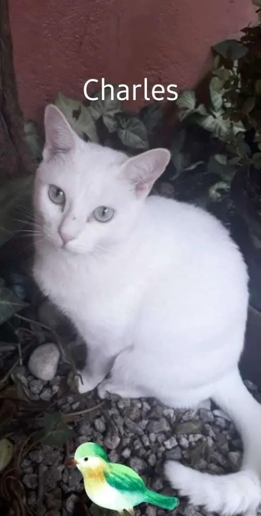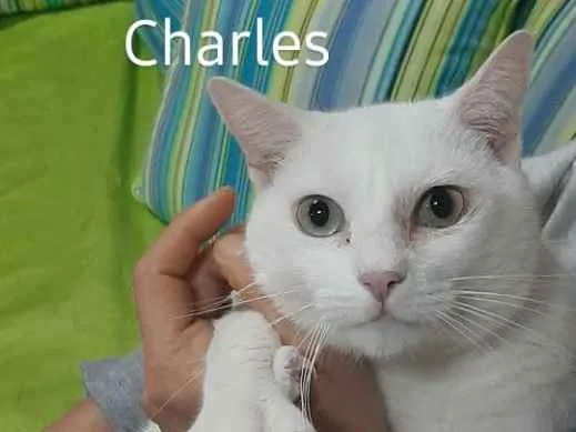 Eu me chamo Charles, sou um garotinho castrado,muito dócil,charmoso, com lindos pêlos branquinhos e macio, tenho 2 anos, ainda sou uma adolescente ,muito alegre, adoro dar beijinhos, sou dengoso, receber carinho e comigo mesmo, fico o dia todo brincando com um ratinho de plástico que e adotei.