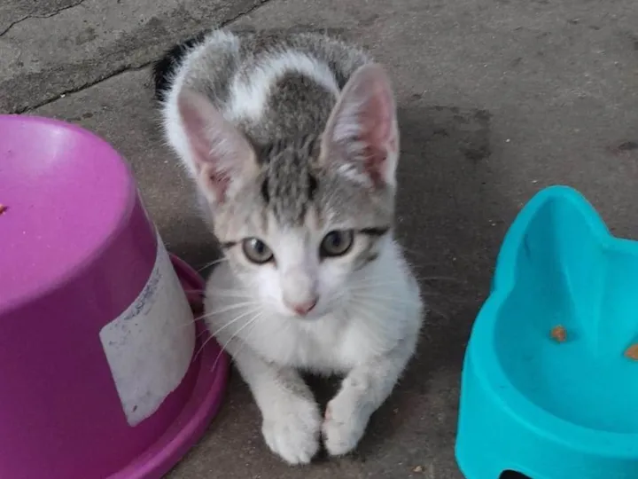 Adoção de Flor, gata SRD fêmea de 2 a 6 meses em São Paulo. Castrada e dócil, ama comer e é super carinhosa. Ideal para casa com quintal.