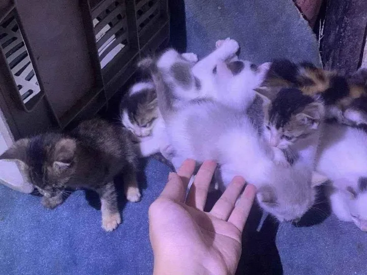 Gata adulta, de porte pequeno, com 7 filhotes de 1 mês.