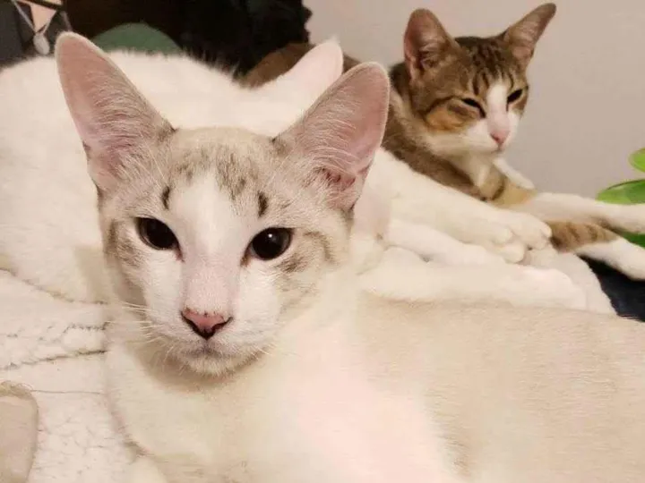 Macho, aproximadamente sete meses, pelagem branca com cinza, olhos azuis. Resgatado de um local em que corria risco com a mãe e os irmãos, sofreu alguns traumas e por isso é um gato mais medroso, alguns dos irmãos de ninhada foram mortos por cães.