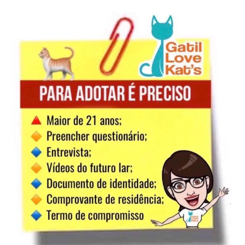 Processo de adoc¸a~o com questiona´rio, entrevista, fotos e vi´deos comprovando a seguranc¸a do local. Adoc¸a~o apenas para maiores de 21 anos com apresentac¸a~o do RG e comprovante de reside^ncia.