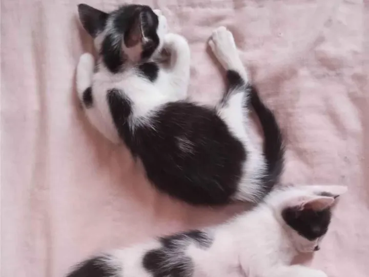 Dois gatinhos machos de 2,5 meses. Já comem ração e sachê e usam caixa de areia. Muito amorosos, adoram colo e brincam muito. Muito acostumados dom pessoas. Felizes e divertidos.