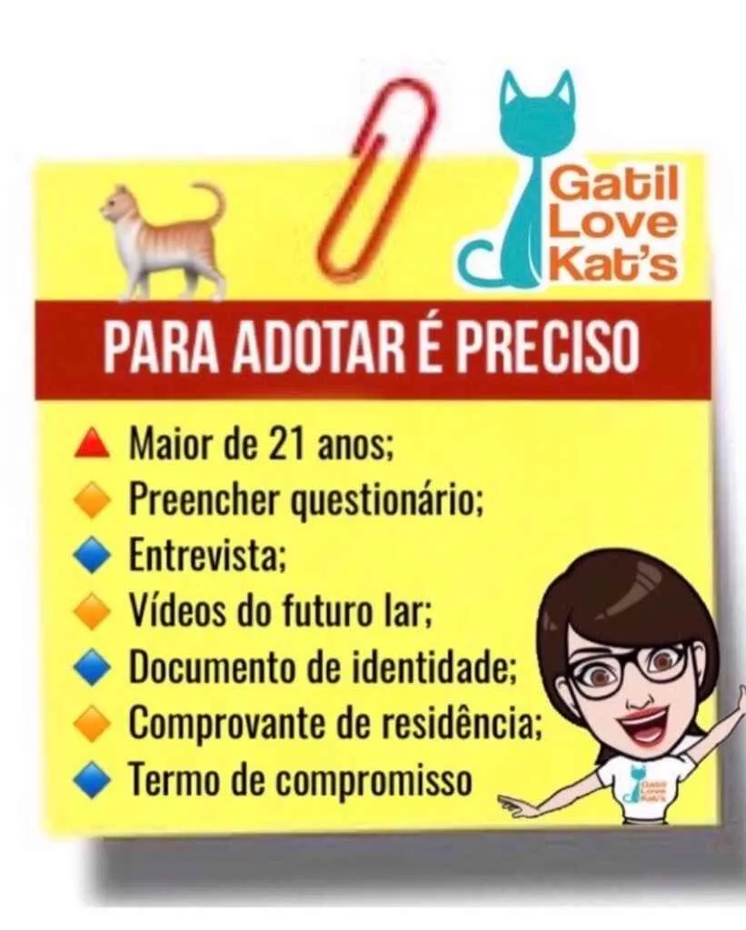 Processo de adoc¸a~o com questiona´rio, entrevista, fotos e vi´deos comprovando a seguranc¸a do local. Adoc¸a~o apenas para maiores de 21 anos com apresentac¸a~o do RG e comprovante de reside^ncia.