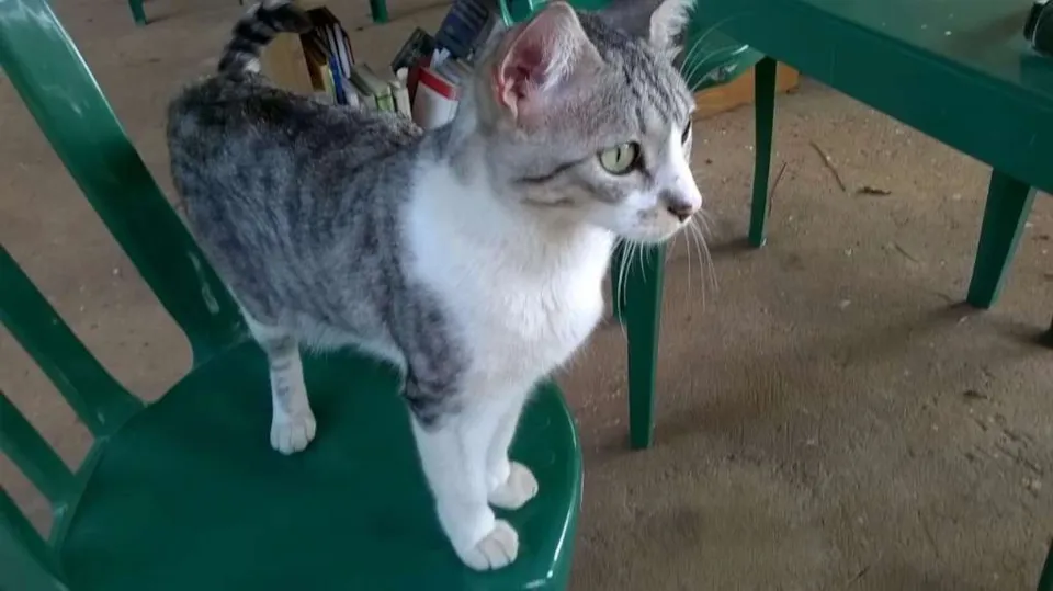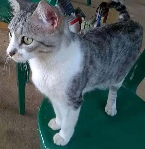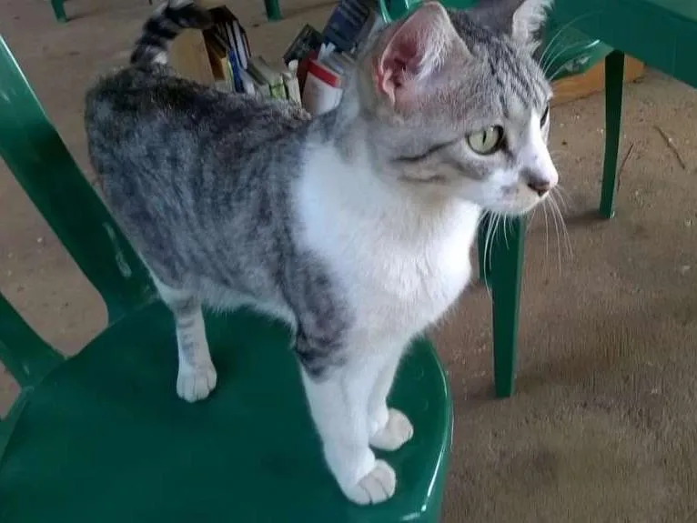 É um gatinho branco e cinza, rajado nas costas. Tem uma manchinha no fucinho, e nariz rosa. Foi encontrado no Parque Cordeiro no bairro Chácara Monte Alegre. É castrado, estava desidratado, é muito dócil, gosta de humanos e está bem magro