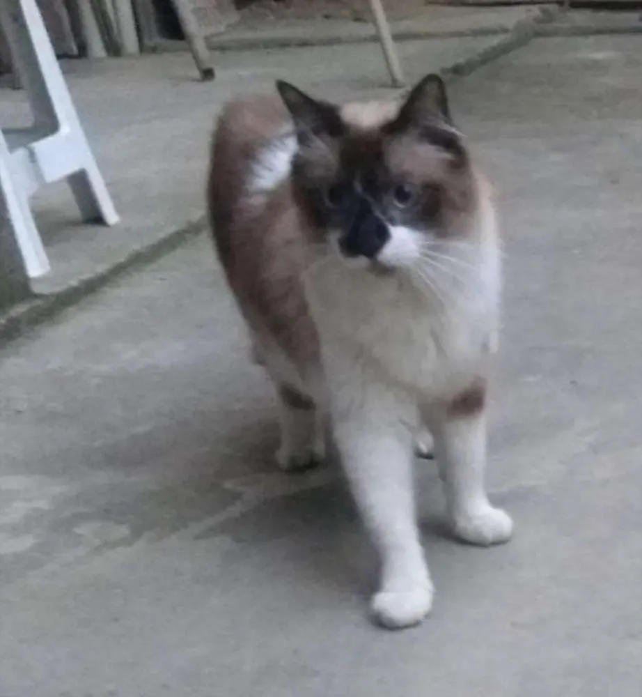 ELE É BRANCO E BEGE TEM OS OLHOS AZUL E O FOCINHO PRETO COM UM MACHINHA PRETA DO LADO DO FOCINHO