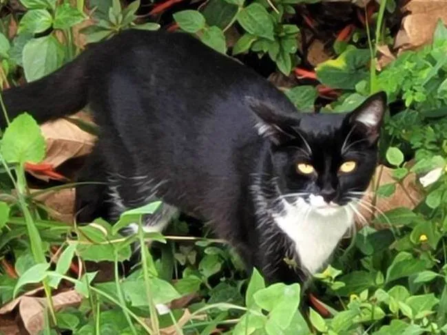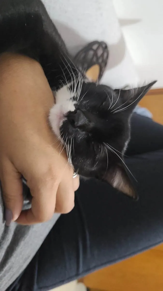 É uma gatinha pequena, muito carinhosa. Mais preta do que branca, as 04 patinhas brancas. Está a com uma coleira e a fichinha de identificação da prefeitura de SP. Ela é castrada.