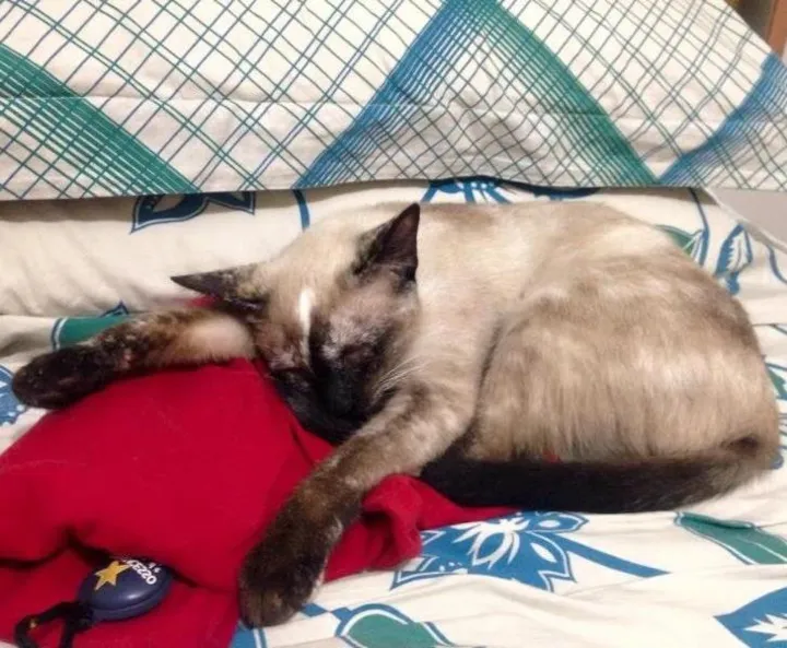 Gata pequena, muito dócil, lembra um siamês só que com uma mesclagem clara, tem uma manchinha branca no meio da testa, tem os olhos azuis bem clarinhos.