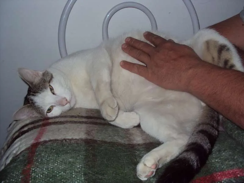Ele é branco com manchas cinzas, tem uma mancha em formato de coração do lado da barriguinha, parte interna de uma perninha é tigradinha, manso mas assustadinho com estranhos, olhos verdes, pesa 6 quilos, pode ter perdido peso.