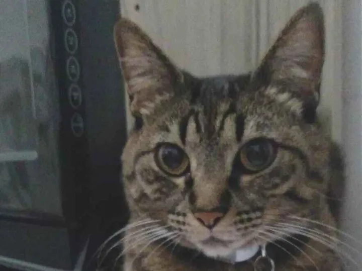 Gata de médio a pequeno porte, rajada de olhos laranja amarelados com 3 dentes caninos menores do que o normal ( 1 na parte de cima e os 2 de baixo ). Ela estava usando coleira com identificação qu...
