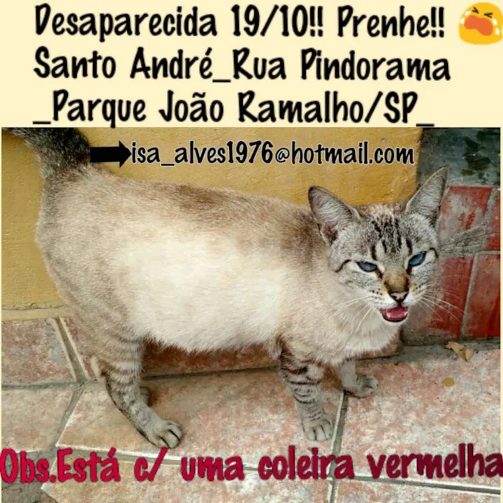 Está prenhe,prestes a ter os filhotes,sumiu com uma coleira vermelha no pescoço, em Santo André_Rua Pindorama -Parque João Ramalho-SP .Ficava aqui na minha rua,em uma casa abandonada, e vinha todos os dias comer ração, beber água,e receber amor,cuidava dela como se fosse minha,porém não podia ficar com ela,pois tenho 17 gatos,então pedi resgate pra ela no facebook, e uma moça de Santo André, a resgatou,porem no terceiro dia (19/10)ela fugiu,e não foi isso que desejei para ela ,o pior é que ela nem conhece o lugar,pois vivia aqui onde moro na Brasilândia Z/N de São Paulo.Quando ela aparecer ficarei com ela até encontrar uma adoção com casa telada,sem acesso as ruas,mais seguro enfim...é isso Ela precisa ser encontrada !!
