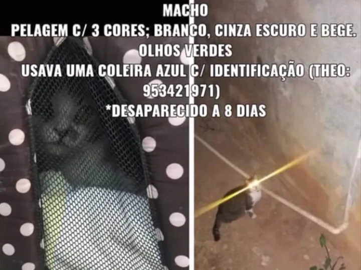 Theo, macho, dez anos de idade, três cores, sendo branco, bege e cinza escuro(tigrado) Extremamente arisco, fugiu da casa da nova tutora pois a dona dele minha amiga faleceu e ele foi doado para essa amiga dela em Carapicuiba próximo á estrada da fazendinha. Minha amiga falecida amava-o demais e ela pediu em vida que ele fosse muito bem cuidado. Estou muito triste pois me senti impotente por ele não ter ficado comigo, a família decidiu assim. Em minha casa ele não teria fugido pois é tudo telado e se ele for encontrado ficarei com ele.