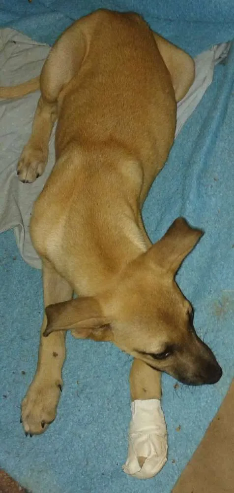 Oi gente, este anjinho foi abandonado e atropelado em frente a minha casa, cuidamos dos ferimentos e agora ela está bem melhor, demos vermifugo, medicamento anti-pulgas e carrapatos mas não podemos ficar com ela, pois já temos outros 4 cães em casa.