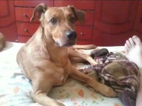 O toby é um viralata de porte medio, caramelo, tem manchinhas pretas na barriga, e está com dermatite, portanto seu pelo esta meio falhado nas orelhar e pernas.