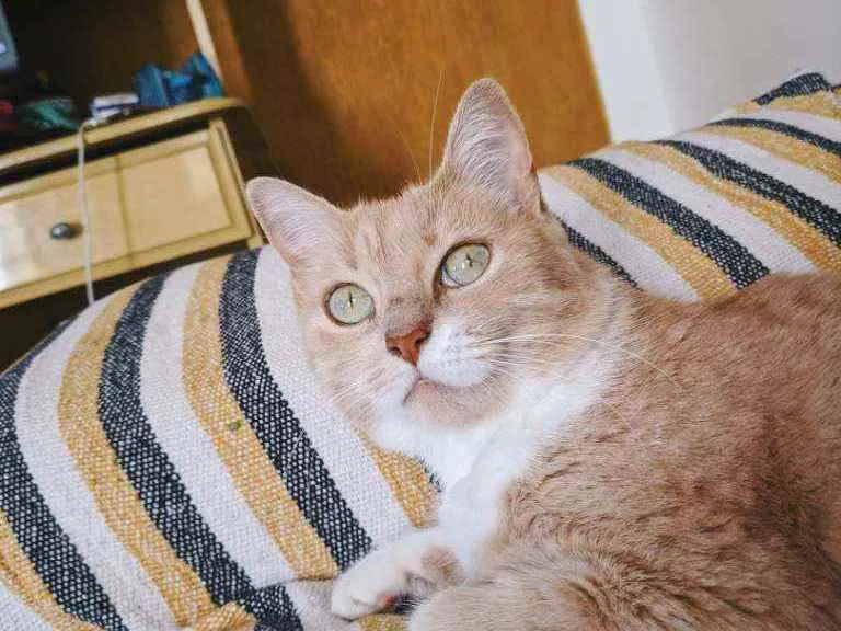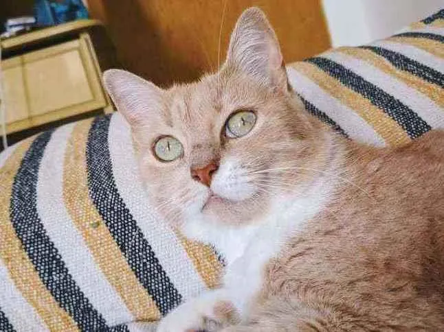 Ela tem olhos amendoados entre amarelo e verde, os pelos são amarelo claro e branco, ela tem a cara achatada.