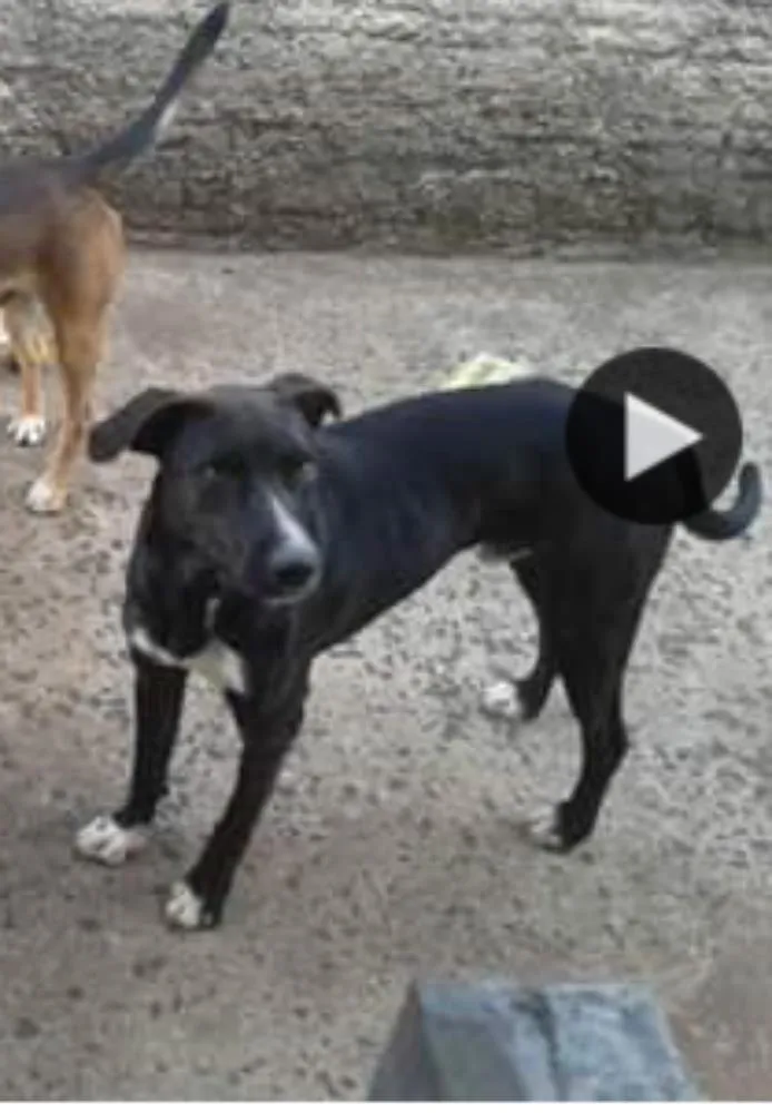 Preto com manchas brancas nas patas e peito. Dócil e carinhoso.