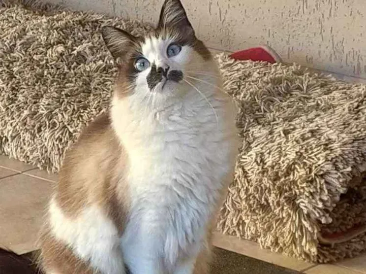 Pelagem branca com retalhos caramelo e marrom, mancha marrom escura no meio da cara, olhos azuis,rabo marrom.