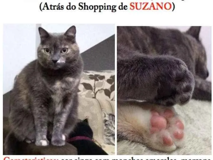 Cor acinzentada com marron,amarelo e branco (misturado). Olhos verdes, pelos macios, patas grossas, castrada, tem um pé traseiro com borrachinhas preta e outro pé borrachinhas brancas, dócil . A pata da frente direita tem só um dedo cor branca . (Recompensa)
