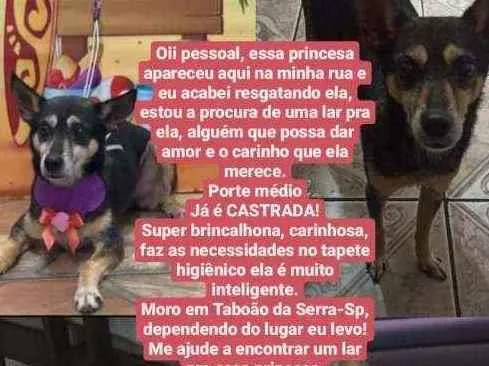 Encontrei abandonada na rua e Não tenho espaço e não posso ficar encontrei ela machucada porém levei ao veterinario ela já está bem e é CASTRADA ela é super fofa e tá esperando um lugar melhor não é brava e doce