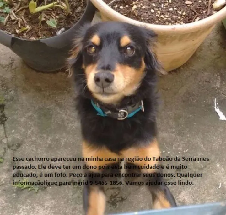 Ele esta bem cuidado e é educado. Esta com uma coleira preta com detalhes em verde.