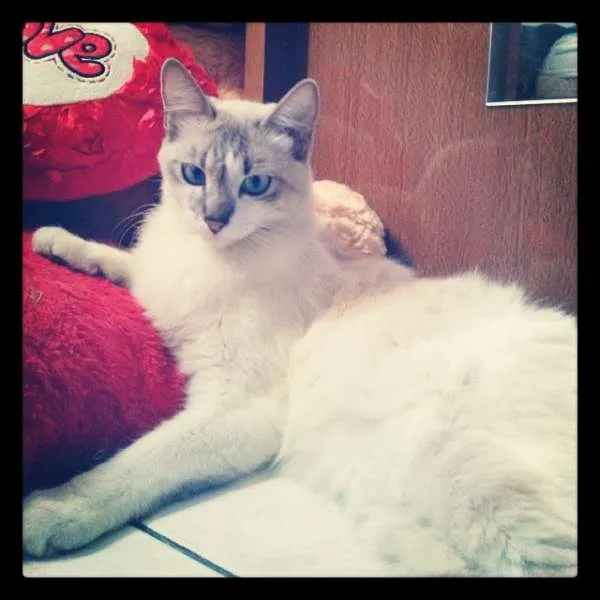 É um gato, de porte médio, peludo, branco, o rabo é cinza degrate, e ele tem umas manchinhas bege pelo corpo e no rosto é braco com cinza, tem o olho azul e é meio vesguinho. Muito carinhoso, amoroso e bonzinho, é gordo, come bastante, e castrado (só dou ração de gato castrado). Ele sumiu por volta do dia 17/11 a noite, no bairro da estiva em taubaté, perto da garagem da ABC. Estou oferecendo recompensa em dinheiro.