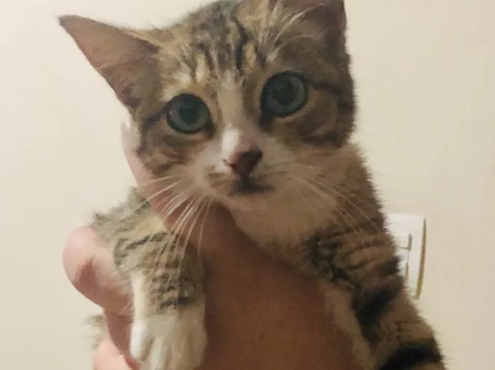 Gatinha mesclada, caramelo preto e branco, com nariz rosa encontrada em Vargem Grande Paulista.
