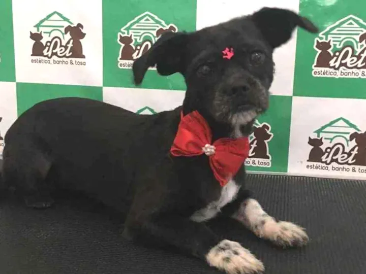 Shitszu preta, tosada, as patas dianteiras brancas, pelos brancos no queixo, estava usando uma roupinha preta com desenho de ursino, ela tem 1 ano e 2 meses, atende pelo nome de Amora, é castrada é super dócil.