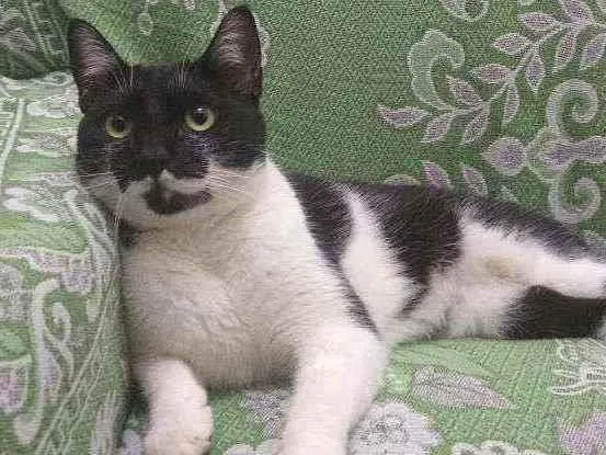 Gata castrada preto e branco e tem uma mancha preta no queixo, estava com uma coleira de pedrinhas como brilhante.