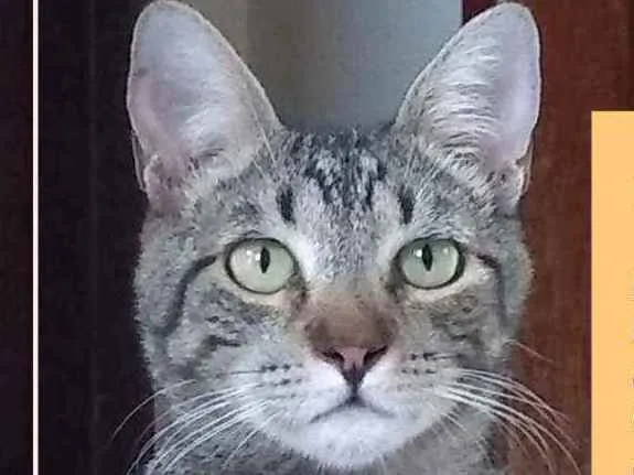 Um gato médio tigrado cinza, castrado, com barriguinha pelancuda, mas pode ser que tenha emagrecido, tem olhos são meio verde acinzentado(não sei definir exatamente), deve estar usando uma coleira listrada vermelha branca e preta, mas pode ser que ele tenha conseguido removê-la depois da fuga. Foi diagnosticado com Felv, e estava no meio do tratamento. É medroso, se chama Bolonhesa, mas nós chamamos ele de Gatinho. Favor contatar por e-mail, não estou com meu celular sempre por perto, eu posso perder a ligação.