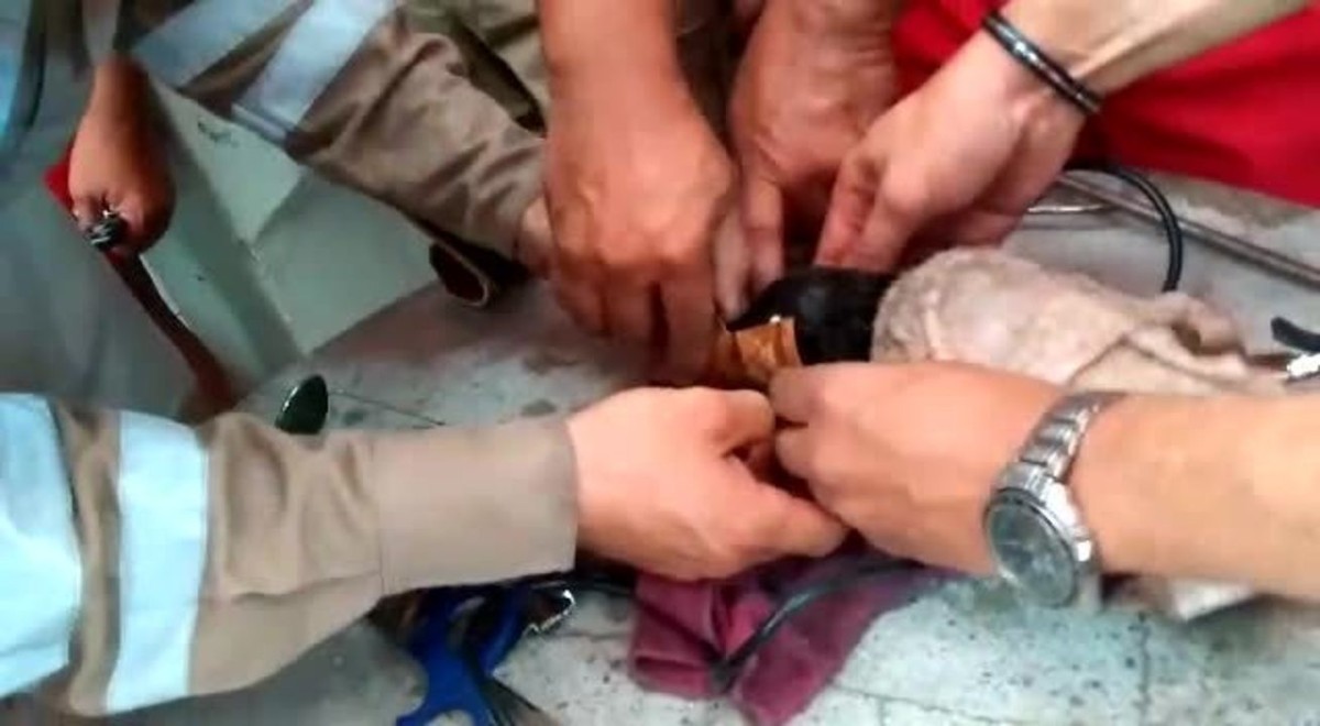 O filhote foi encontrado por dois policiais militares, que o levaram ao Quartel Central dos Bombeiros, também na região central da cidade. No local, uma equipe de bombeiros assumiu a ocorrência e fez a retirada do cano, com o auxílio de uma ferramenta microrretífica.